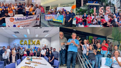 Empregados e empregadas da Caixa Econômica Federal realizaram, em diversas cidades do país, manifestações em comemoração aos 165 anos do banco público, reafirmando o orgulho pela história da instituição e pela sua função social estratégica. Os atos também denunciaram os impactos do fechamento de agências, da redução do quadro de pessoal e das condições de trabalho impostas aos trabalhadores, além de cobrar o fortalecimento da Caixa como banco público a serviço da população.
