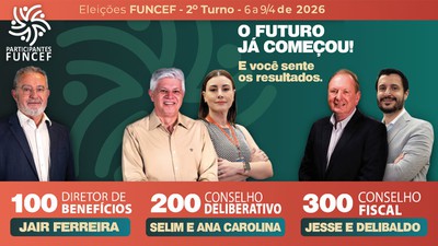 O SEEBCG-MS, Contraf-CUT, Fetec-CUT/CN e Fenae reafirmam seu apoio às candidaturas de Jair Ferreira (100) para a Diretoria de Benefícios, Selim Oliveira e Ana Carolina (200) para o Conselho Deliberativo, e Jesse Krieger e João Delibaldo (300) para o Conselho Fiscal no segundo turno das eleições da Fundação dos Economiários Federais (Funcef), que ocorre entre os dias 6 e 9 de abril de 2026.