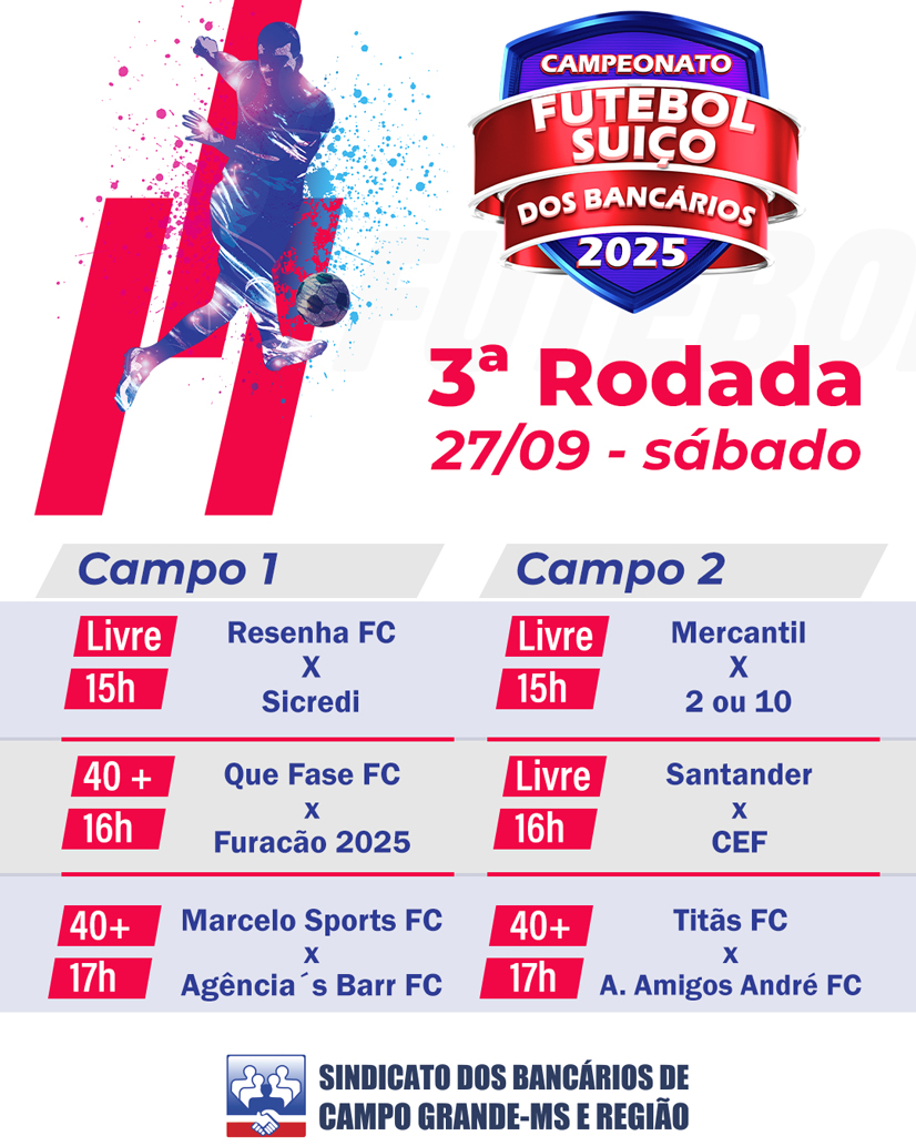 No último sábado, 20 de setembro, o Clube de Campo do Sindicato dos Bancários de Campo Grande-MS e Região foi palco de uma tarde de muita emoção e confraternização. A segunda rodada do Campeonato de Futebol Suíço dos Bancários 2025 movimentou o gramado com 6 partidas das categorias Livre e 40+.