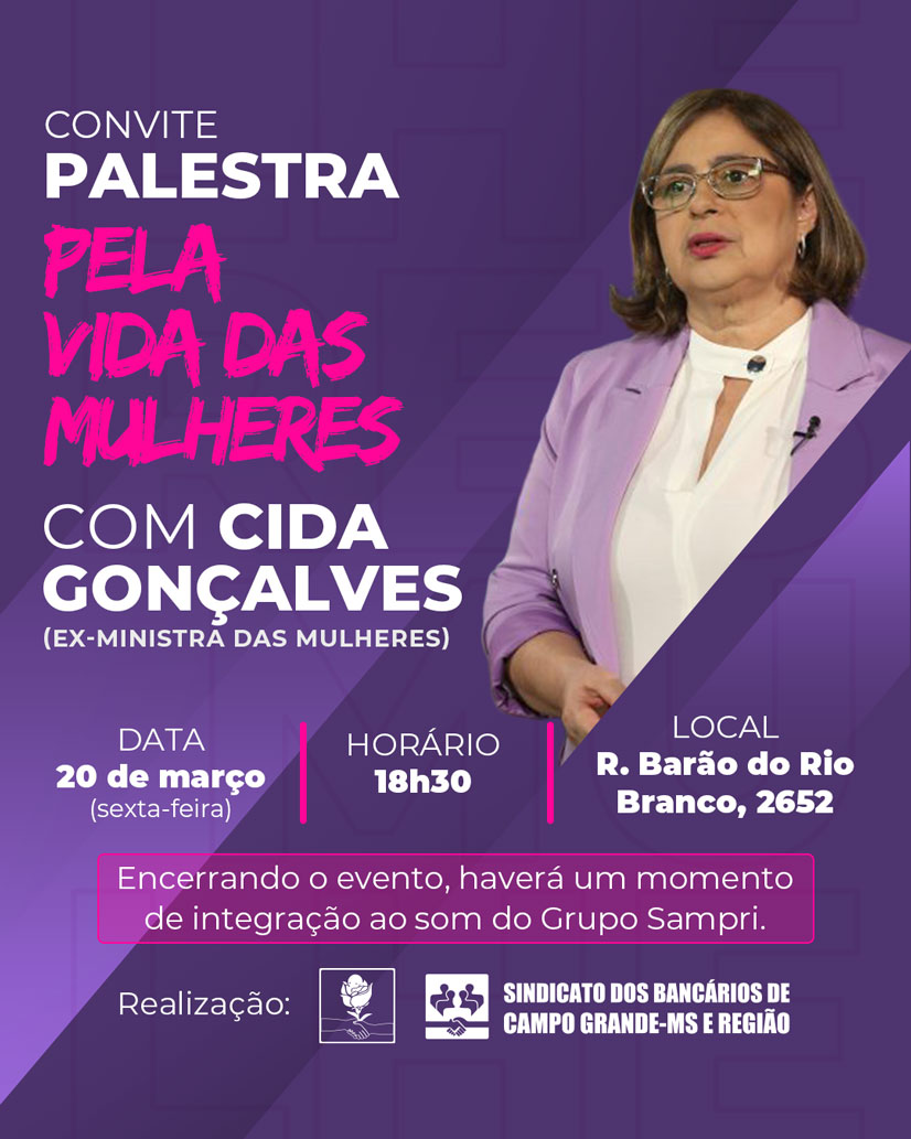 Em alusão ao Mês da Mulher, o Sindicato dos Bancários de Campo Grande-MS e Região realiza, no dia 20 de março (sexta-feira), às 18h30, a palestra “Pela Vida das Mulheres”. A palestra será ministrada pela ex-ministra das Mulheres, Cida Gonçalves, na sede da entidade (Rua Barão do Rio Branco, 2652).