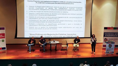 O setor bancário aparece como estudo de caso, já que investe mais de R$ 40 bilhões por ano em tecnologia e 96% das instituições já utilizam IA em seus processos. “Em 2024, a categoria conquistou cláusulas inovadoras, como a proibição da cobrança de metas por aplicativos, o direito à desconexão, verbas para requalificação e cursos específicos para mulheres em TI. Também foi instituído um Observatório de IA, responsável por acompanhar softwares, aplicações e impactos no setor”, lembrou.