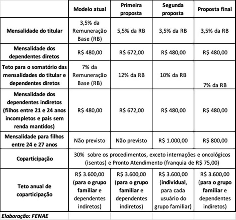 A proposta apresentada pela Caixa mantém os mesmos valores nos itens de custeio até o vencimento do Acordo Coletivo dos empregados (31/08/2026), quando as condições do plano serão discutidas, em conjunto com as demais cláusulas. Confira abaixo a tabela comparativa das propostas apresentadas pela Caixa para a custeio do plano, e as respostas às dúvidas mais frequentes: