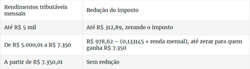 Para rendas entre R$ 5.000,01 e R$ 7.350, há uma redução parcial e decrescente do imposto: