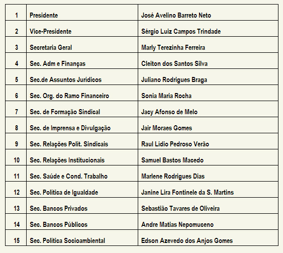 Na nova diretoria eleita é composta por 64 membros, 15 dos quais compõem a diretoria executiva. Todos os 12 sindicatos filiados estão representados.