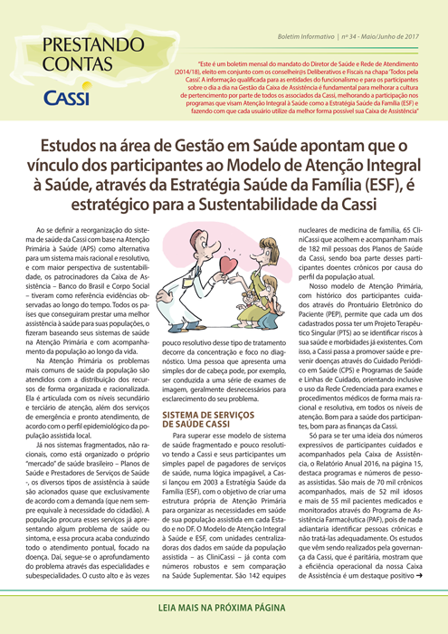 O 34º Boletim Informativo da Cassi “Prestando Contas” está disponível. A edição deste mês mostra que sistemas que se organizam a partir da Atenção Primária à Saúde (APS) conseguem melhorar o acompanhamento aos usuários e melhoram a saúde dos beneficiários, o que permite, ainda, minorar os custos e garanrir sua sustentabilidade.