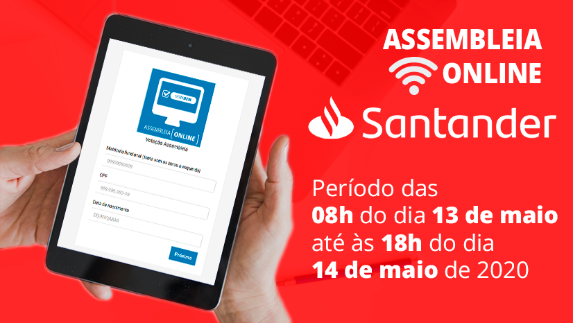 Bancários, associados ou não, que prestam serviços no Conglomerado do Banco Santander, na base territorial deste sindicato, já podem participar da assembleia que se realiza de forma remota/virtual, por conta da pandemia do coronavírus.
