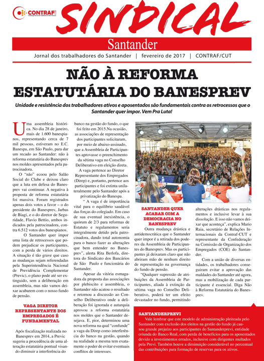 A edição de fevereiro/2017 do Jornal Sindical dos Trabalhadores do Santander já está disponível em nosso site. Clique abaixo e leia na íntegra: