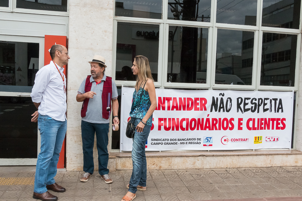 Nessa terça-feira, dia 26 de julho, o Sindicato dos Bancários realizou manifestações em cinco agências do Santander que ficam na região central de Campo Grande. Todas tiveram a abertura retardada em uma hora pelos dirigentes sindicais – em vez de 11 horas, o horário de atendimento começou ao meio dia.