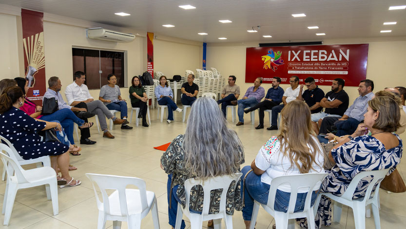 Em uma noite de diálogo construtivo, empregados e aposentados da Caixa Econômica Federal se reuniram na sede do Sindicato dos Bancários de Campo Grande-MS e Região para uma roda de conversa. O evento contou com a presença de Sérgio Takemoto, presidente da Fenae, e de Fabiana Uehara, conselheira do Conselho de Administração (CA) da CEF, e foi promovido em parceria pela entidade sindical e pela Apcef/MS