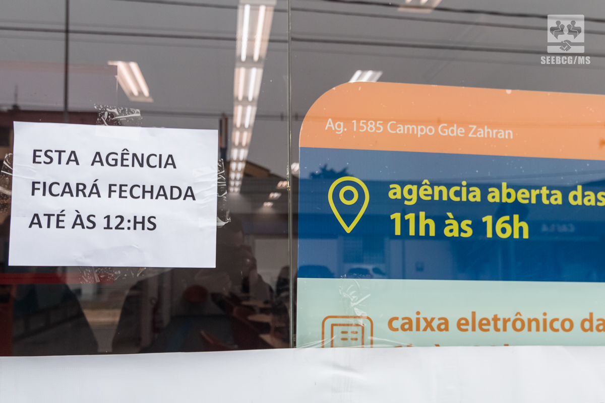 Depois de rejeitar a proposta dos bancos por considerar insuficiente, o Comando Nacional dos Bancários indicou que os sindicatos fizessem um dia de paralisação total ou parcial nessa quarta-feira (dia 22). Em Campo Grande, o SEEBCG-MS retardou em 1h a abertura das agências da Avenida Eduardo Elias Zahran, que só abriram depois do meio dia.