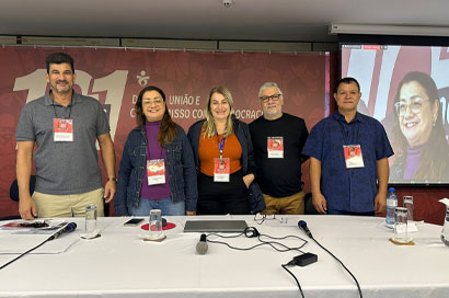 Os diretores do SEEBCG-MS - Rubens Jorge Alencar, Luciana Rodrigues, Álvaro Marzochi Jara, Juliana Fabiola Furucho, Everton José Espindola e Laerte Romero -, aprovaram as deliberações dos congressos dos empregados do BB e da Caixa.