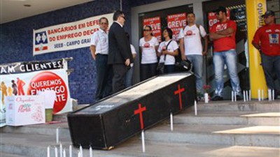 Na manifestação realizada na entrada da agência, o comando organizou um cenário fúnebre com um caixão, enterrando simbolicamente a gerência do BB, faixas e cartazes sob forte barulho de apitaço e buzinaço, contestando a posição da Federação Nacional dos Bancos (Fenaban), que ainda não se manifestou em promover um encontro para iniciar as negociações.