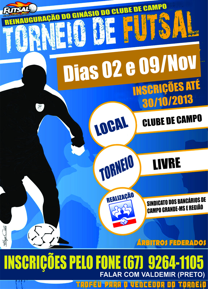 Acontece nos dias 02 e 09 de novembro, o Torneio de Futsal de Reinauguração do Ginásio do Clube de Campo do Sindicato dos Bancários de Campo Grande-MS e Região.