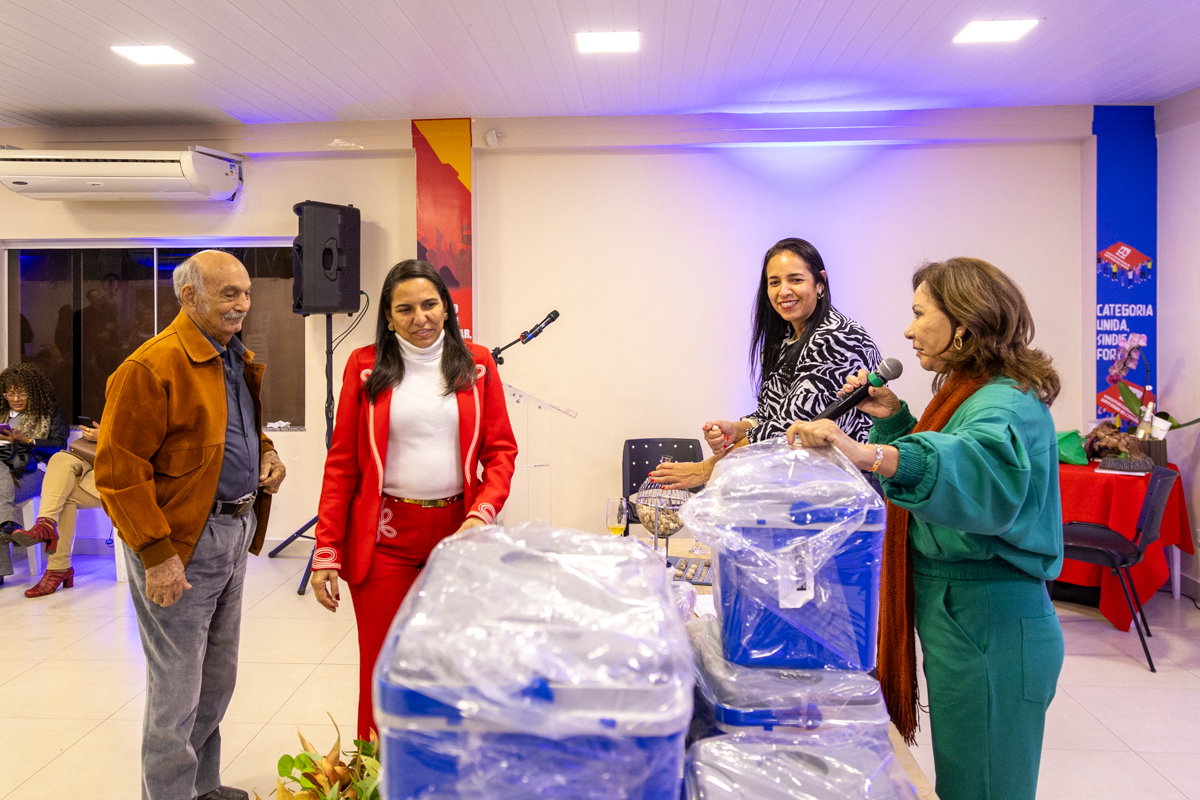 “Cada conquista, cada vitória, cada direito, foi fruto do suor, da coragem e da união de todos que aqui estão e de muitos que já se foram. É importante sempre lembrar – principalmente para os mais jovens – que cada direito da nossa Convenção Coletiva não veio de presente dos bancos, mas sim da luta incansável do movimento sindical”, disse Neide. As principais conquistas da categoria foram compiladas em um caderno de anotações, lançado e distribuído a todos os convidados pelo sindicato nesta noite festiva.