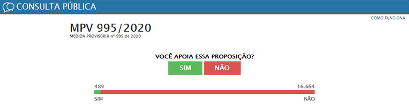 A MP 995 segue agora para votação no Congresso, mas os bancários podem se manifestar contra a pauta. No portal e-Cidadania, que funciona para que todos os cidadãos possam opinar sobre as matérias que chegam ao Congresso Nacional, a MP 995 está entre as proposições mais votadas no dia. Nas últimas 24 horas, mais de 16 mil pessoas se manifestaram contra a medida. O SEEBCG-MS CONVOCA OS BANCÁRIOS PARA VOTAREM CONTRA ESSA MEDIDA.