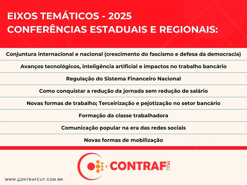 Apesar de 2025 não ser um ano de campanha salarial, as conferências regionais e estaduais vão acontecer, por serem espaços estratégicos de troca de informações e discussões que dão subsídios aos dirigentes bancários de todo o país. Além disso, as atividades fazem parte da organização para a 27ª Conferência Nacional dos Bancários, que acontecerá de 22 a 24 de agosto deste ano, como explica Juvandia Moreira, presidenta da Confederação Nacional dos Trabalhadores do Ramo Financeiro (Contraf-CUT) e uma das coordenadoras do Comando Nacional dos Bancários:
