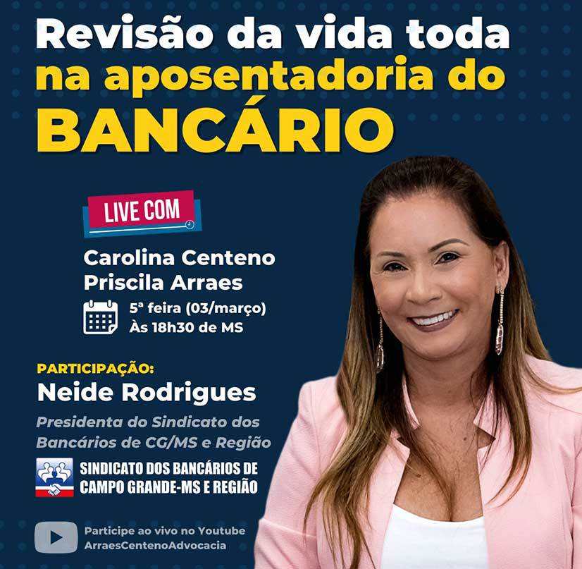 Nesta quinta-feira, dia 03 de março, a presidenta do Sindicato dos Bancários de Campo Grande-MS e Região, Neide Rodrigues, vai participar de uma live para discutir a “Revisão da vida toda na aposentadoria do bancário”. A transmissão será a partir das 18h30 (horário de MS) através do canal do Youtube do escritório Arraes e Centeno.