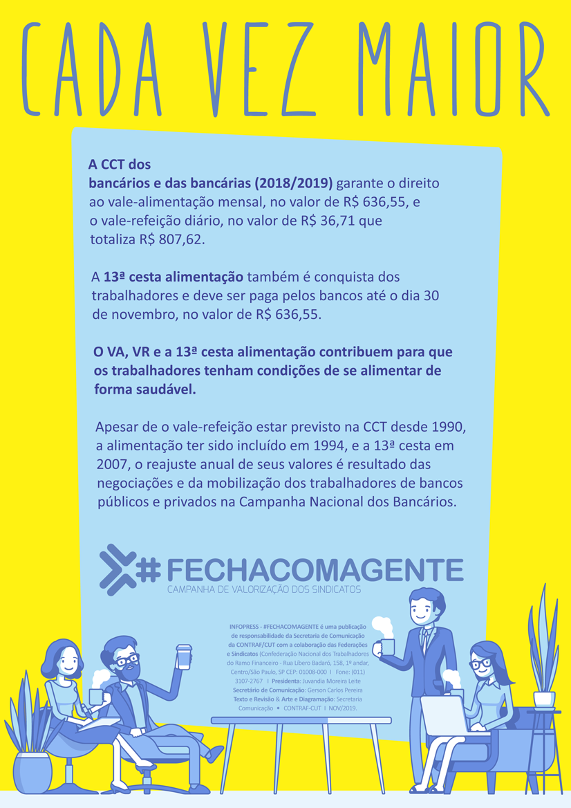 A Confederação Nacional dos Trabalhadores do Ramo Financeiro (Contraf-CUT) disponibilizou a edição Vale-alimentação e Vale-refeição do InfoPress da Campanha #FechaComAGente.