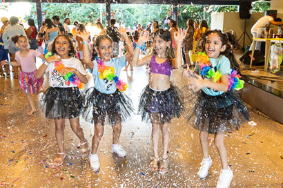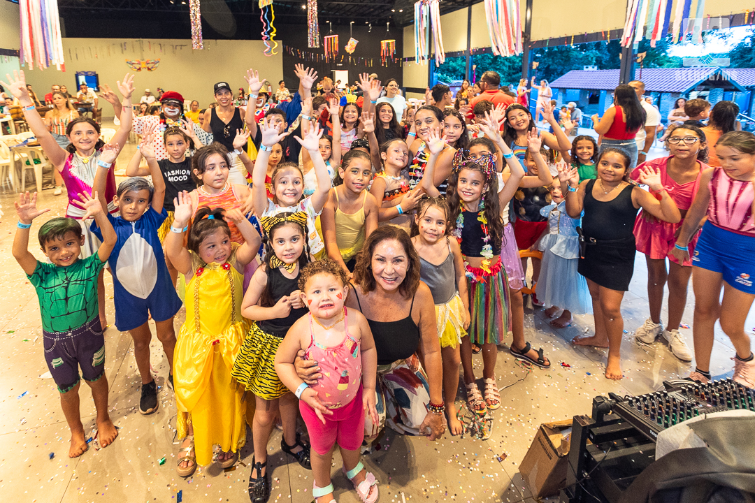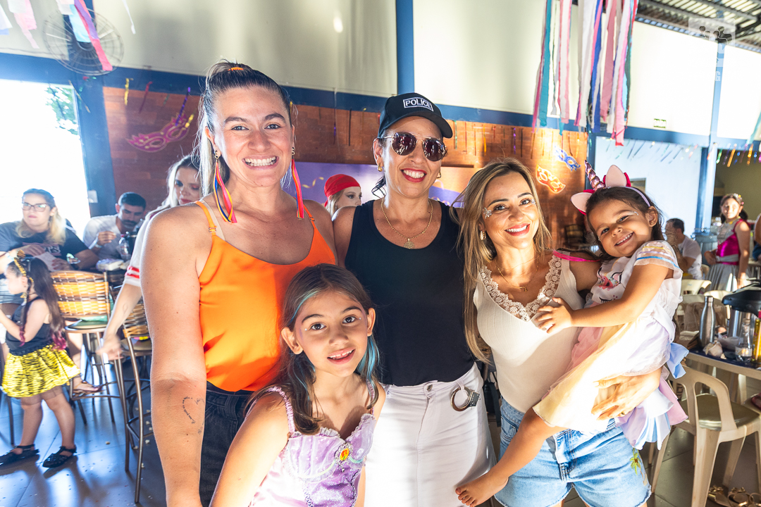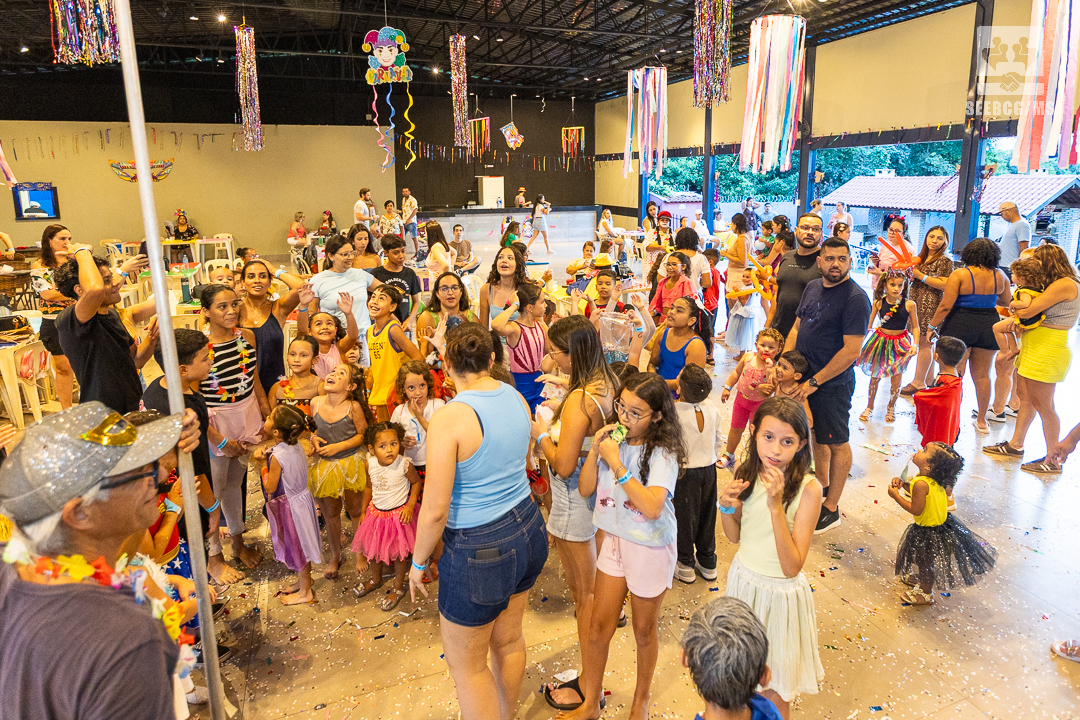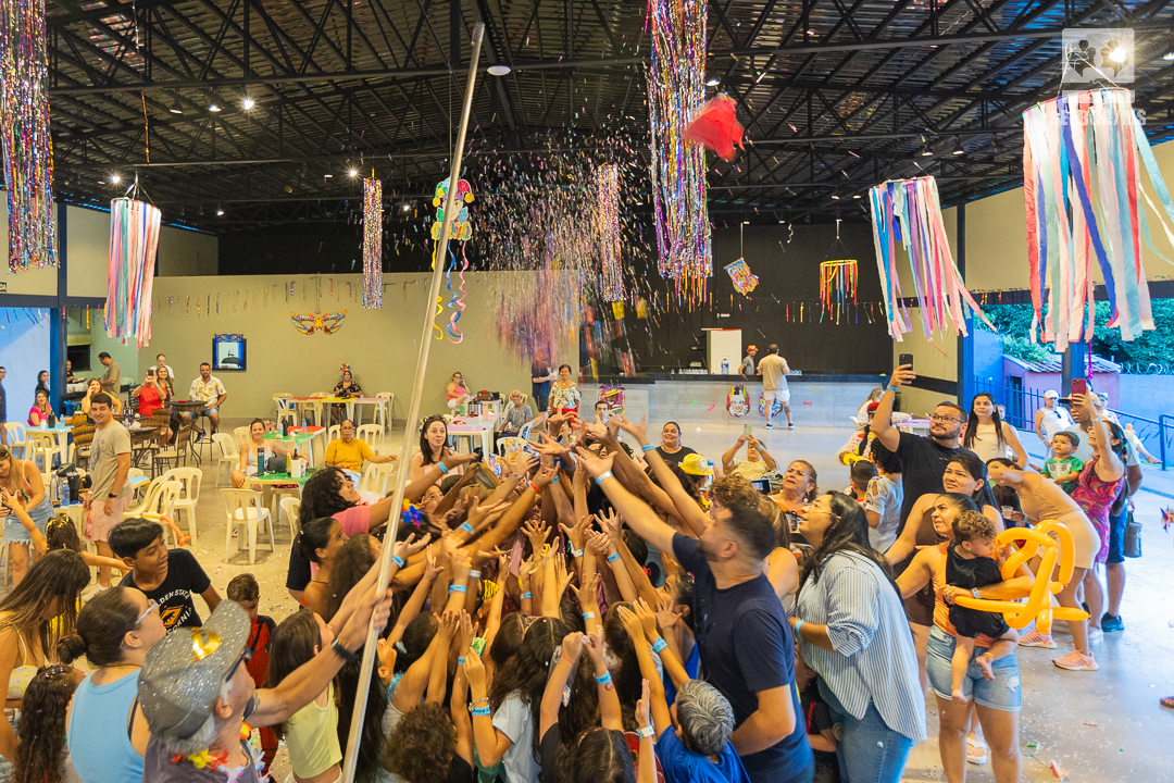 Para garantir a diversão, recreadoras marcaram presença com dinâmicas que animaram a tarde. Entre uma brincadeira e outra, as crianças gastaram energia pulando corda, brincando de pega-pega e disputando as guloseimas do tradicional "balão gigante" estourado no meio do salão.