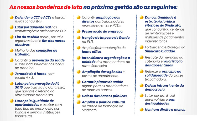 Entre os compromissos apresentados pela chapa estão a defesa da CCT e dos acordos coletivos, o combate ao assédio moral e às metas abusivas, melhorias nas condições de trabalho e a preservação do emprego. Também integram as propostas a valorização salarial, a luta por PLR mais justa e políticas de saúde para a categoria. Conheça as bandeiras da Chapa 1:
